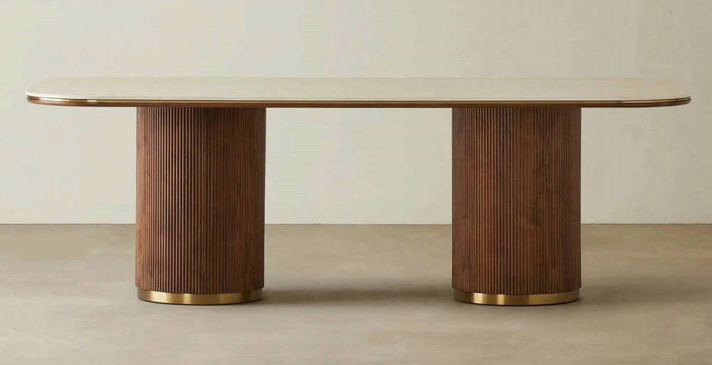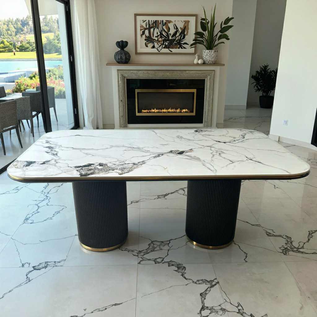 Each table in this collection showcases a sintered stone top with a travertine finish, capturing the timeless beauty of aged architecture.